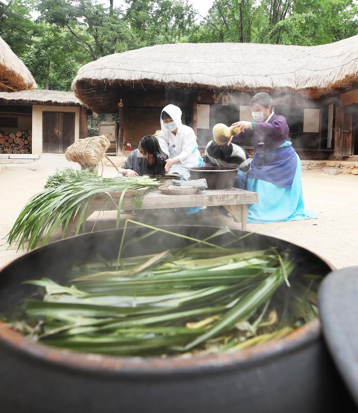 단오를 이틀 앞둔 23일 오후 경기 용인시 한국민속촌에서 관계자들이 창포물에 머리 감기 시연을 하고 있다.