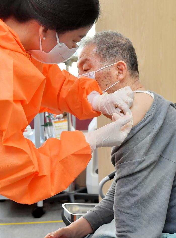 23일 오전 광주 북구 동행요양병원에서 65세 이상 환자들이 아스트라제네카(AZ) 백신을 접종 받고 있다.