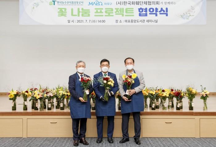 서울 마포구는 지난 7일 한국농수산식품유통공사 및 (사)한국화훼단체협의회와 꽃을 활용한 사회공헌 및 ESG경영 실천을 위한 업무협약을 체결했다. 협약 내용은 국산꽃을 활용한 나눔활동을 통해 사회취약계층에 활기를 불어넣는 사회공헌 사업의 추진이다. 사진은 협약식에서 유동균 구청장(오른쪽)이 나눔꽃을 만든 후 기념촬영을 하는 모습. (사진제공=마포구청)