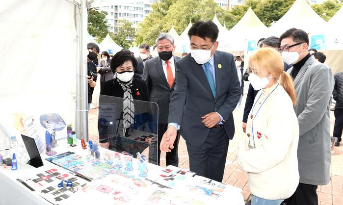 오승록 서울 노원구청장이 21일 ‘2021 노원구 일자리 박람회&창업지역경제 한마당’에 참석했다. 이 행사는 코로나19 장기화로 어려움을 겪고 있는 구직자들에게 다양한 일자리 정보 제공 및 창업 관련 정보를 제공하기 위해 마련됐다. 사진은 오 구청장(가운데)이 창업관에서 다양한 아이디어 우수 상품을 둘러보고 있는 모습. (사진제공=노원구청)