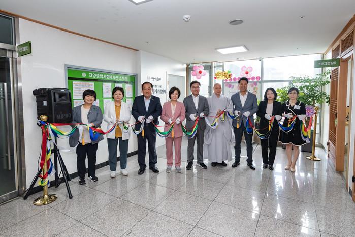 서울 광진구가 초등돌봄 사각지대를 해소하고 질 높은 돌봄 서비스를 제공하기 위해 '광진1호점 우리동네키움센터'를 지난 17일 문열었다. 사진은 개소식에 참석한 김선갑 구청장(가운데)이 참여자들과 테이프 커팅을 하는 모습. (사진제공=광진구청)