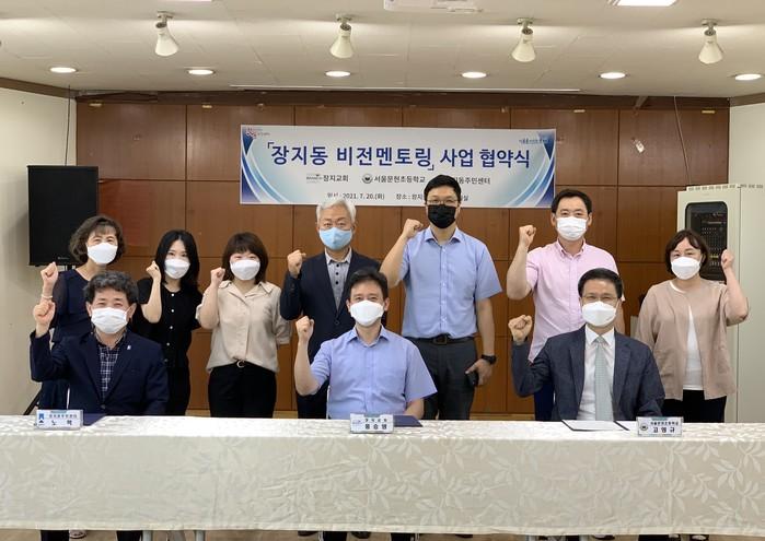 서울 송파구 장지동 주민센터는 최근 장지교회·서울문현초등학교와 장지동 비전멘토링사업 업무협약식을 했다. 장지교회는 멘토 모집·추천 및 프로그램 운영을, 서울문현초등학교는 멘티 모집·추천 및 프로그램 운영 지원을, 장지동 주민센터는 프로그램 운영을 위한 물적·인적자원을 지원한다. 사진은 협약식에서 관계자들이 기념촬영을 하는 모습. (사진제공=송파구청)