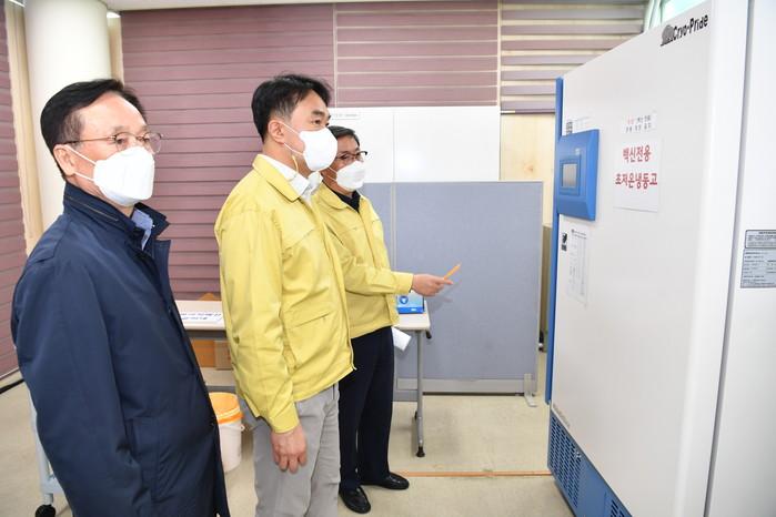 경기 하남시가 6일 75세 이상 시민 대상 코로나19 백신 접종을 앞두고 하남종합운동장 제2체육관에 설치 중인 예방접종센터 준비상황을 점검했다. 사진은 김상호 시장(가운데)이 관계자들과 센터에 설치된 백신전용 초저온냉동고를 둘러보고 있는 모습. (사진제공=하남시청)