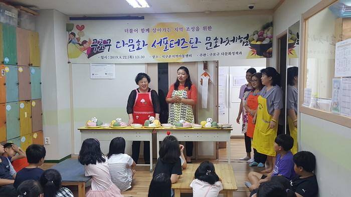 22일 서울 구로구 지구촌지역아동센터에서는 추석을 맞아 다문화가족 아동 30명을 대상으로 ‘송편 빚기 체험행사’를 진행했다. 사진은 다문화서포터즈단 단원들이 아동들에게 송편 빚는 방법을 설명하고 있는 모습.(사진제공=구로구청)