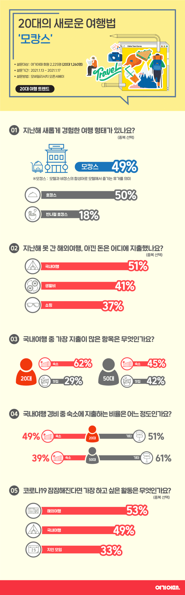 이번 설문은 모바일리서치 오픈서베이를 활용해 지난 13~17일 진행됐다. 여기어때 이용자 총 2225명이 참여했으며, 이중 20대는 1260명이었다.