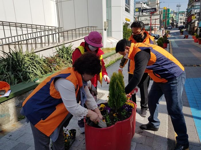 경기 수원시 장안구 율천동 주민자치회와 율천동지킴이봉사단은 사계절 꽃길 조성을 위한 마을정원 만들기 사업의 일환으로 최근 지역내 밤밭문화의 거리와 신일아파트 정류장 일대에 봄꽃을 식재했다. 사진은 참여자들이 꽃을 심고 있는 모습. (사진제공=장안구청)