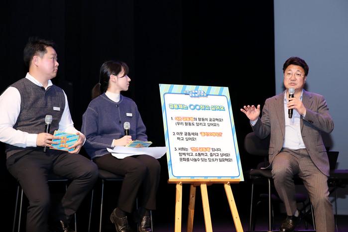 경기 이천시가 11일 이천아트홀 소공연장에서 엄태준 시장을 비롯 마을공동체 활동가와 시민 등 200여명이 참석한 가운데 '2019년 행복마을공동체 한마당' 행사를 개최했다. 사진은 엄 시장(오른쪽)이 토크콘서트에서 시민들의 질문에 답하는 모습. (사진제공=이천시청)
