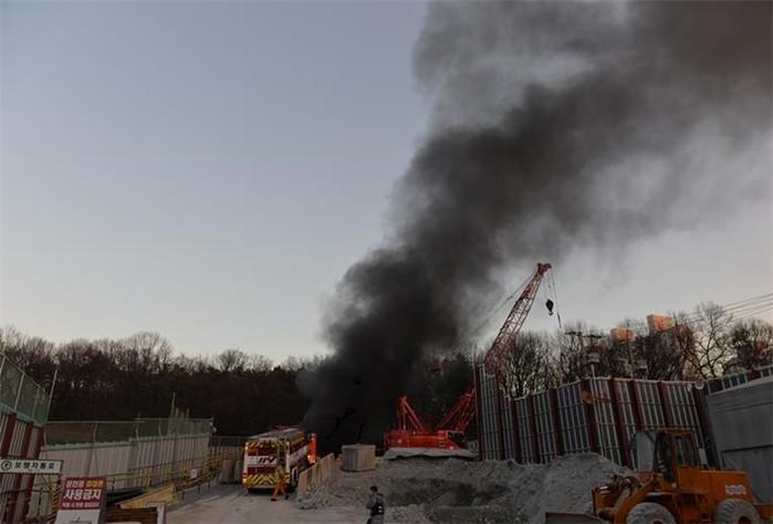 지난 19일 오후 경기 고양시 덕양구 화정동 수도권광역급행철도(GTX) A노선 3공구 공사현장에서 지하 발파작업 중 불이 나 검은 연기가 퍼지고 있다.