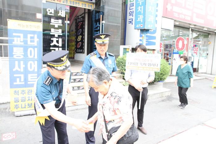경기 부천오정경찰서는 최근 유동인구가 많은 원종사거리에서 전부서가 참여한 가운데 ‘서민3不(불안·불신·불행’ 사기범죄 및 전화금융사기 예방 및 수사권 조정에 대한 관심 촉구 캠페인을 전개했다. 사진은 홍보물을 전달하고 있는 모습. (사진제공=부천오정경찰서)