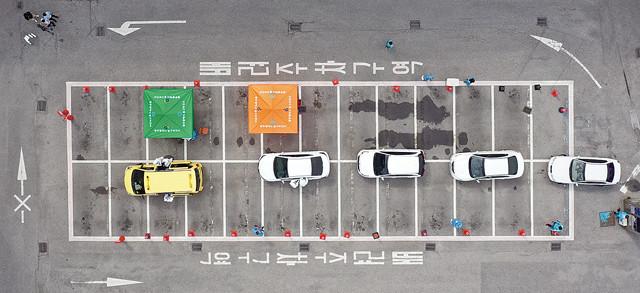 어린이집 원생 남매 2명이 코로나19 확진 판정을 받은 가운데 6일 오전 광주광역시 동구청 주차장에 마련된 임시 드라이브 스루 선별진료소에서 동구보건소 직원들이 확진자가 나온 어린이집 원생들과 가족들을 대상으로 검체를 채취하고 있다.