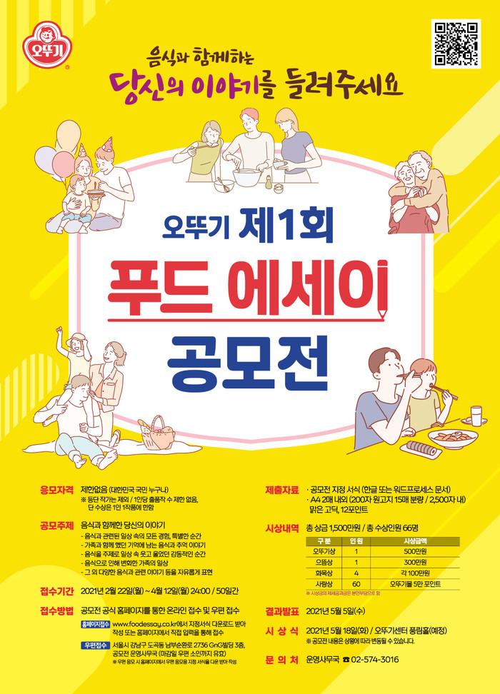 ‘오뚜기 제1회 푸드 에세이 공모전’ 은 총 상금 1500만원 규모로, 오뚜기상(1명) 상금 500만원, 으뜸상(1명) 상금 300만원, 화목상(4명) 각 100만원의 상금이 주어진다.