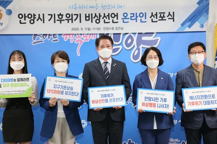 경기 안양시가 7일 '기후위기 비상선언 선포식'을 온라인으로 개최했다. 이날 선포식은 지구온난화로 자연재해가 끊이지 않고 있으며 위기의식을 가져야 한다는 의미로 마련됐다. 사진은 이날 최대호 시장(가운데)을 비롯한 기관단체장들과 청소년들이 기후위기 비상사태를 선포하는 손팻말을 들고 기념촬영을 하는 모습. (사진제공=안양시청)