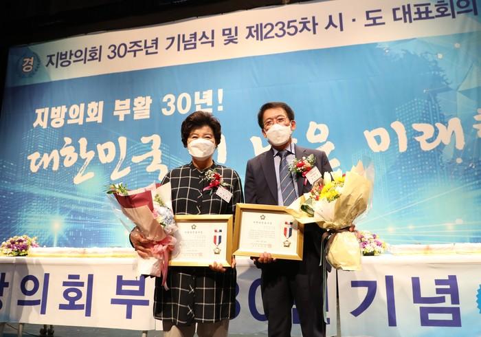 [용인=오왕석 기자] 용인시의회 김기준 의장(구갈·상갈·보라·상하동/더불어민주당)과 박원동 의원(원삼·백암·양지면,동부동/국민의힘)이 22일 오후 1시 성남아트센터 앙상블시어터에서 전국시군자치구의회의장협의회 주최로 열린 ‘지방의회 30주년 기념식’에서 지방의정봉사대상을 수상했다.
