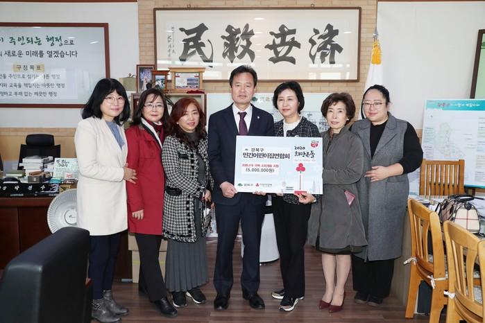 서울 강북구가 최근 구 민간어린이집 연합회로부터 코로나19 극복을 위한 성금 500만원을 전달받았다. 전달된 성금은 사회복지공동모금회를 통해 지역내 취약계층을 돕는 데 사용될 예정이다. 사진은 박겸수 구청장(가운데)과 관계자들이 기념촬영하는 모습. (사진제공=강북구청)