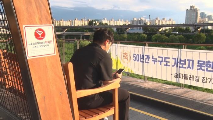 | ▲ 송파둘레길 탄천 구간에 설치된 공공와이파이를 이용하는 주민의 모습. (사진제공=송파구청) |