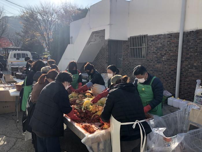 경기 포천시 신북면새마을회가 김장철을 맞이해 4일 '2020년 사랑의 김장 담가주기 행사'를 개최했다. 이날 새마을지도자협의회와 면 새마을부녀회원들은 김장김치 450포기를 담가 각 마을의 경로당 및 홀몸노인 등게게 전달했다. 사진은 이날 봉사자들이 김장김치를 담그는 모습. (사진제공=포천시청)