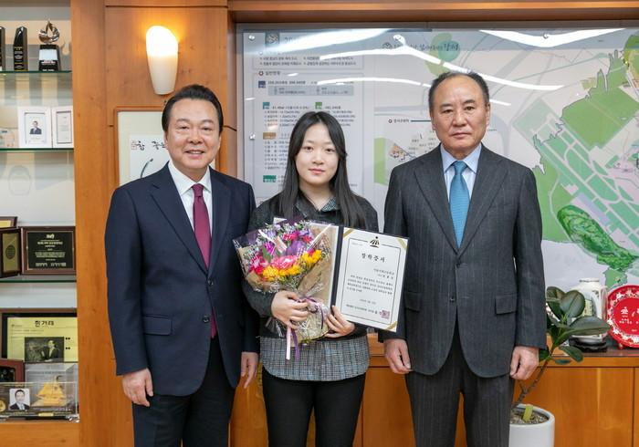 서울 강서구는 19일 구청장실에서 ‘행복장학금 수여식’을 개최하고 장학생들에게 장학증서를 전달했다. 이번에 선발된 장학생은 서울국제고등학교 재학생 3명이다. 사진은 노현송 구청장(왼쪽)이 장학생에게 꽃다발을 전달한 후 기념촬영을 하는 모습. (사진제공=강서구청)