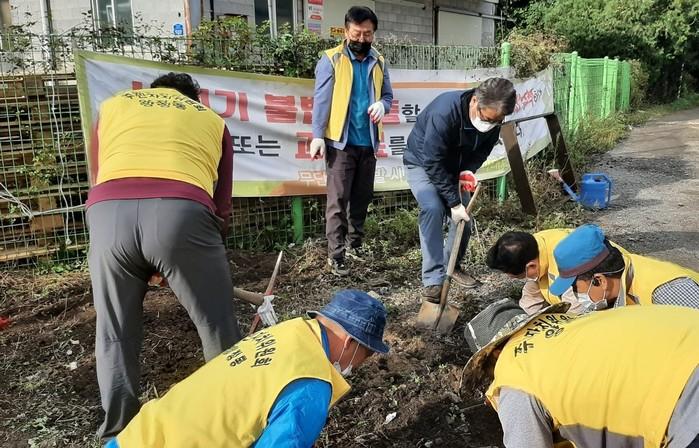 경기 남양주시 양정동은 최근 양정동 주민자치위원회와 함께 지역내 상습 무단투기 지역의 폐기물과 잡초를 정리한 후 꽃묘식재를 하며 환경정화 활동을 진행했다. 사진은 이날 주민자치위원들이 꽃묘를 심고 있는 모습. (사진제공=남양주시청)