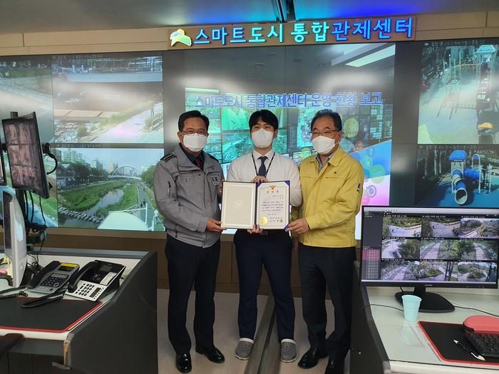 | ▲ 서부경찰서장으로부터 감사장을 수여받은 모니터링 담당자(가운데)가 기념촬영을 하고있다. (사진제공=은평구청) |