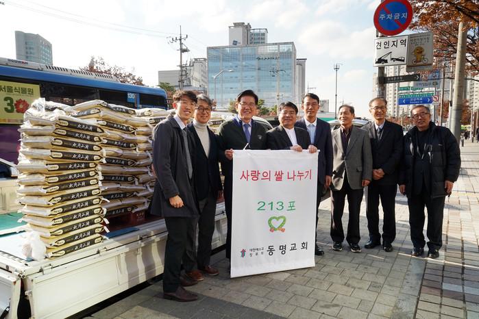 26일 서울 동대문구 동명교회가 지역내 소외된 이웃을 돕기 위해 ‘사랑의 쌀’ 2130kg(10kg/포, 환가액 710만원 상당)을 전달했다. 사진은 쌀 전달식에서 유덕열 구청장(왼쪽에서 세 번째) 및 최홍연 부구청장(왼쪽에서 다섯 번째), 동명교회 관계자들이 기념촬영을 하고 있다.(사진제공=동대문구청)