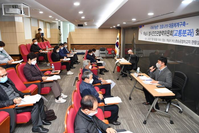 경기 하남시가 16일 '하남시 범시민 민관협력위원회 교통분과 회의'를 열고 코로나19 사회적 거리두기 단계 개편 및 대중교통 이용시 마스크 착용 의무화에 따른 실천방안 등을 논의했다. 사진은 이날 김상호 시장(오른쪽)이 회의를 주재하고 있는 모습. (사진제공=하남시청)
