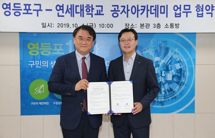 ▲ 채현일 구청장(오른쪽)이 최근 연세대학교 공자아카데미 원장과 업무협약을 체결하고 기념촬영을 하는 모습. (사진제공=영등포구청) |