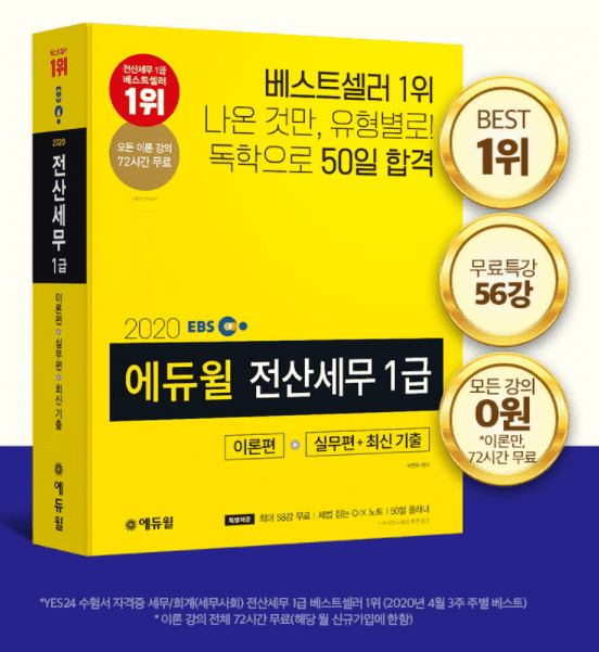 에듀윌에 따르면 10월 1주차 전산세무 1급 부문 1위는 ‘2020 EBS 에듀윌 전산세무1급 이론편+실무편+최신기출’ 교재가, 전산세무 2급 부문 1위는 ‘2020 EBS 전산세무 2급 이론편+실무편+최신 기출’ 교재가 각각 올랐다.
