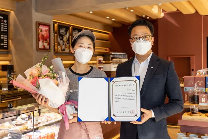 | ▲ 23일 배스킨라빈스 하이브한남점에서 SPC해피봉사단 백승훈 상무가 장학생 한지영씨에게 장학증서와 꽃다발을 전달하고 있다. (사진제공= SPC그룹) |