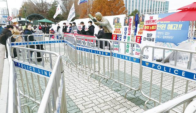 서울 전지역에서 10인 이상의 집회가 금지되는 등 격상된 사회적 거리두기 2단계가 시작된 24일 집회 시위가 빈번한 서울 여의도 국회 앞에 경찰이 설치한 펜스 사이에서 '코로나19 위기에 공공병원 확충예산 0원 국회와 정부 규탄 기자회견'이 열리고 있다.
