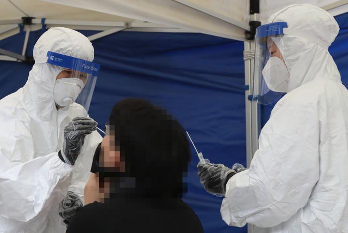 21일 오전 서울 강남구 대치2동주민센터 앞에 설치된 선별진료서에서 지역내 학원강사들이 코로나19 진단검사를 받고 있다. 강남구는 지역내 학원강사 2만여명을 대상으로 하루에 1000명씩 코로나19 전수검사를 시행한다. 구는 대학수학능력시험을 앞두고 전날 대치동의 대형 입시학원 강사 1명이 양성 판정을 받으면서 학원가의 불안감이 커짐에 따라 이같이 조치했다고 밝혔다.