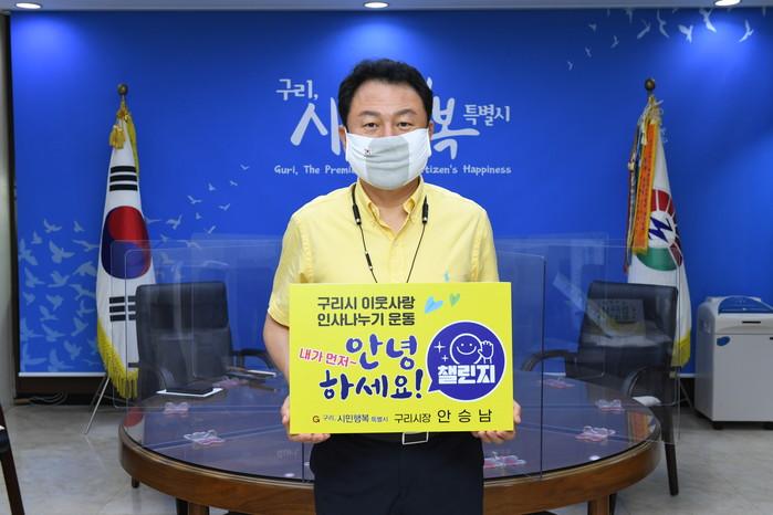 경기 구리시는 15일부터 구리문화원 주관으로 예절의 기본인 인사를 통해 서로 소통하고, 지역공동체를 회복해 소통과 화합으로 시민이 행복한 구리시를 만드는 '이웃사랑 인사 나누기 챌린지'를 진행한다. 사진은 안승남 시장이 챌린지에 동참하고 있는 모습. (사진제공=구리시청)