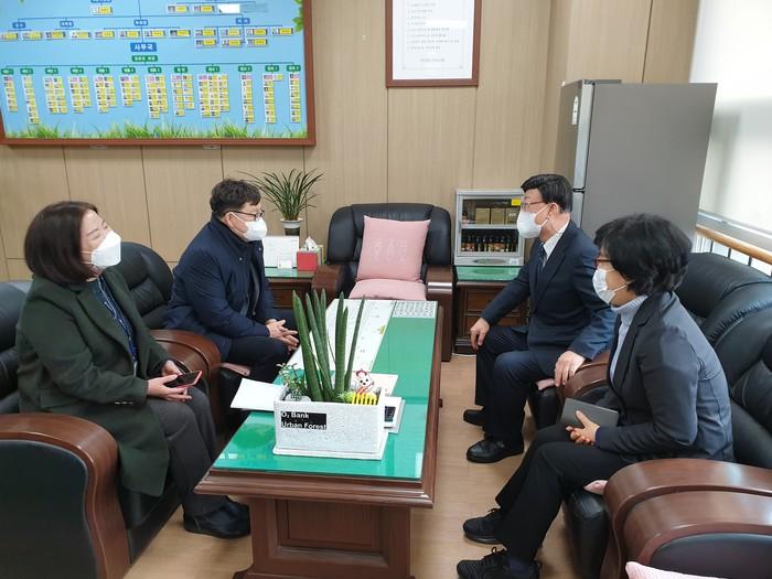 김용덕 경기 수원시 영통구청장은 최근 대한노인회 수원시 영통구지회를 방문해 덕담을 나누고 코로나19로 고생하고 있는 영통구지회 직원들을 격려했다. 사진은 이날 김 구청장이 관계자들과 대화를 나누고 있는 모습. (사진제공=영통구청)