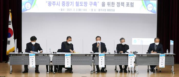 경기 광주시가 2일 중장기 철도망 구축을 위한 정책포럼을 개최했다. 이날 정책포럼에서는 김시곤 대한교통학회장이 '광주시 중장기 철도망 구축 방안'에 대한 주제 발표를 하고 철도 전문가들이 토론을 이어갔다. 사진은 이날 포럼이 진행되고 있는 모습. (사진제공=광주시청)