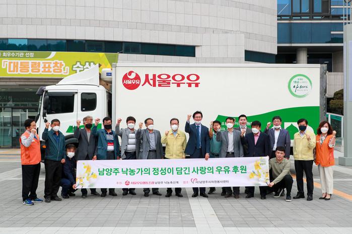 경기 남양주시자원봉사센터가 지난 18일 서울우유협동조합 남양주 낙농축산계로부터 코로나19로 어려움을 겪고 있는 지역내 취약계층을 위한 '사랑의 우유' 864박스(1000만원 상당)를 후원 받았다. 사진은 전달식 후 기념촬영을 하고 있는 관계자들의 모습. (사진제공=남양주시청)