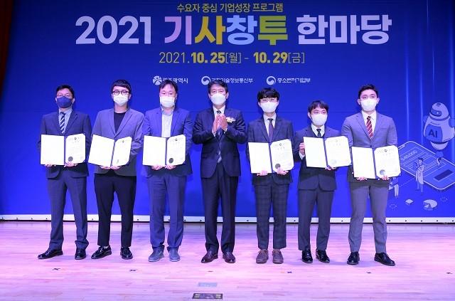 [광주=정찬남 기자] 조인철 광주광역시 문화경제부시장(사진/가운데)이 25일 오후 광주이노비즈센터 다목적강당에서 열린 ‘2021 기사창투(기술·사업화·창업·투자) 한마당’에 참석해 기술사업화 유공자에게 시상한 후 참석자들과 기념촬영을 하고 있다.
