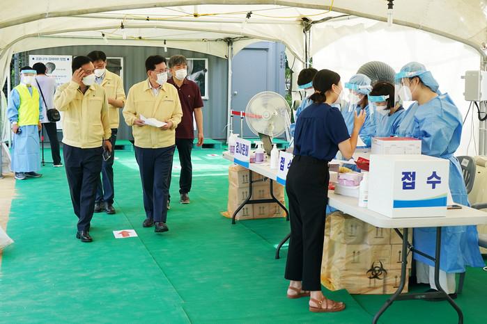 서울 동대문구가 14일 코로나19 확산에 대응하기 위해 장안근린공원에 임시선별검사소를 추가 설치했다. 임시선별검사소는 평일 오전 9시~오후 5시, 주말과 공휴일 낮 12시~오후 4시 운영된다. 사진은 이날 장안근린공원 임시선별검사소 방문한 유덕열 구청장(가운데)이 시설을 점검하고 있는 모습. (사진제공=동대문구청)
