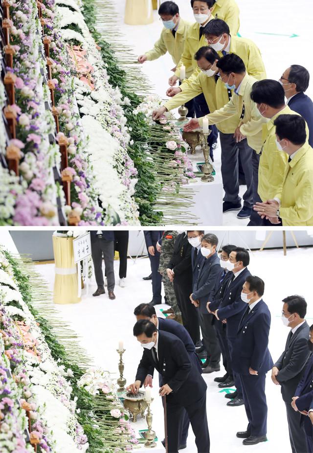 더불어민주당 이해찬 대표가 4일 오후 경기도 이천시 서희청소년문화센터에 마련된 이천 물류창고 공사장 화재 합동분향소에서 헌화하고 있다. 미래통합당 심재철 대표 권한대행도 이천 물류창고 공사장 화재 합동분향소에서 분향하고 있다.