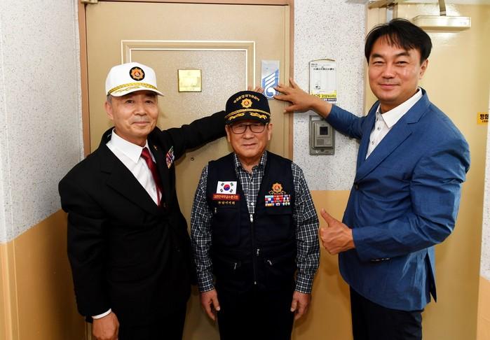 경기 하남시는 1일 덕풍1동에 거주하는 6.25참전유공자의 집을 방문해 국가에 헌신한 것에 대해 감사의 뜻을 표하며 국가유공자 명패를 달았다. 사진은 김상호 시장(오른쪽)과 박규섭 무공수훈자회 회장이 국가유공자와 함께 기념촬영을 하는 모습. (사진제공=하남시청)