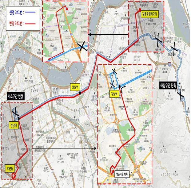 기존 341번 노선은 하남공영차고지에서 출발해 천호대로 중앙버스전용차로 구간을 경유해 잠실역, 강남까지 운행하는 노선이었으나 이번 일부 구간이 조정됐다.