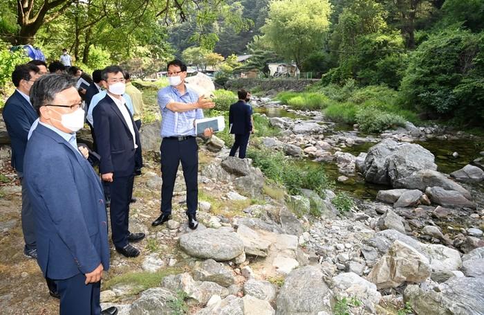 이용철 경기도 행정2부지사가 취임 첫 현장행보로 17일 가평 어비계곡과 용추계곡, 포천 백운계곡을 잇따라 방문해 ‘청정 계곡·하천 복원사업 현장’을 점검했다. 사진은 이 행정2부지사(왼쪽에서 두 번째)가 지역주민, 공무원 등 관계자들과 계곡 곳곳을 둘러보며 정비 상황을 면밀히 살피는 모습. (사진제공=경기도청)