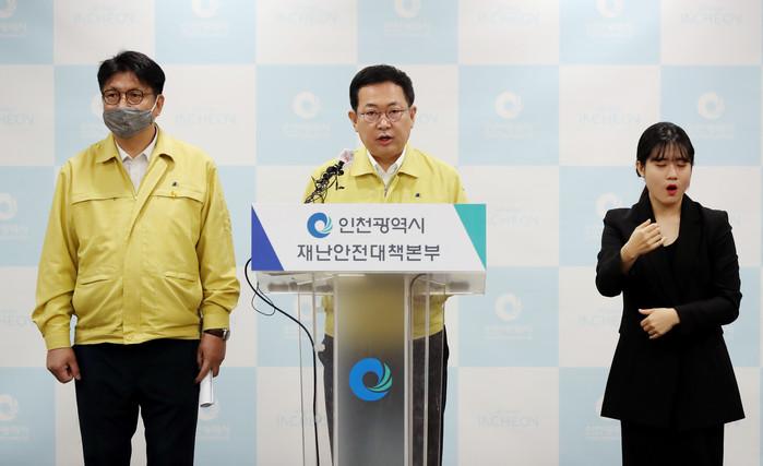 박남춘 인천시장(가운데)이 13일 오전 인천 남동구 인천시청에서 서울 이태원 클럽발 신종 코로나바이러스 감염증(코로나19) 확진자 상황을 설명하는 긴급 기자회견을 하고 있다.