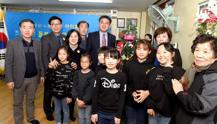 서울 노원구는 최근 상계1동 은빛1단지 경로당에서 오승록 구청장을 비롯해 돌봄기관 종사자 등 80여명이 참석한 가운데 ‘은빛1단지 아이휴(休)센터 개소식’을 개최했다. 사진은 개소식에서 오 구청장과 아이들이 함께 기념촬영을 하는 모습. (사진제공=노원구청)