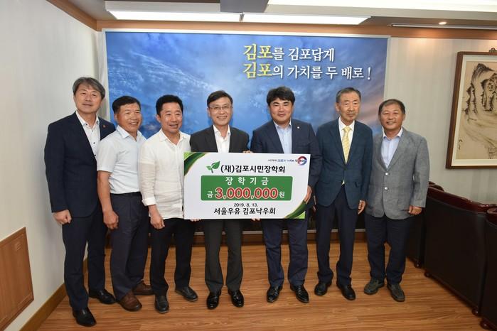 경기 김포시는 최근 서울우유 김포낙우회로부터 장학금 300만원을 기탁받았다. 서울우유 김포낙우회는 2013년부터 매년 지역인재 육성을 위한 장학금을 기탁했다. 사진은 정하영 시장(가운데)과 관계자들이 기념촬영을 하는 모습. (사진제공=김포시청)