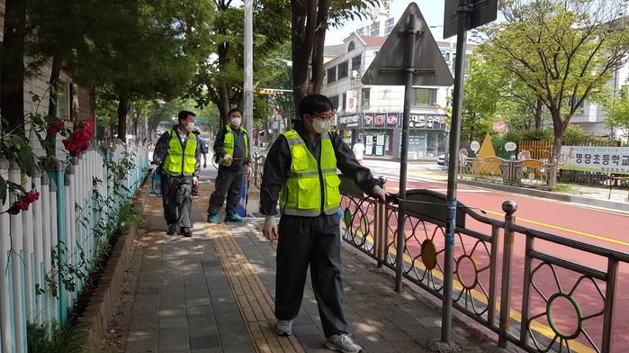 경기 수원시 권선구 곡선동 행정복지센터는 17일 단체 회원과 동 직원으로 구성된 방역지원반이 안룡초등학교 등 곡선동 지역내 학교 6곳 주변 통학로를 집중 방역했다. 사진은 방역지원반이 통학로를 방역하고 있는 모습. (사진제공=권선구청)