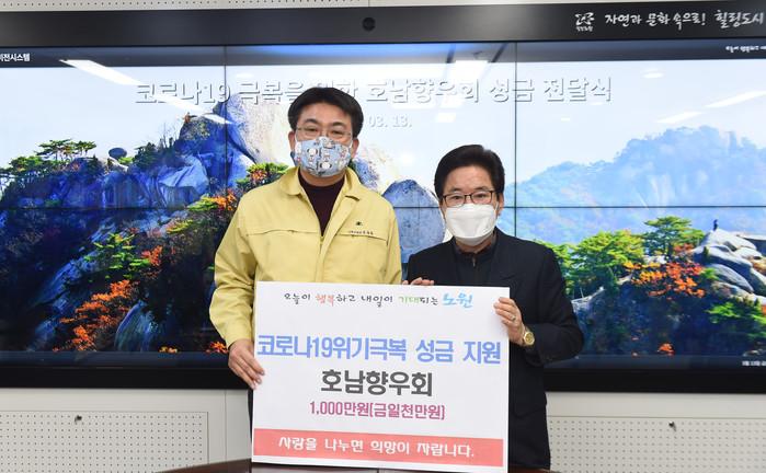 서울 노원구는 최근 구청장실에서 ‘코로나19 위기 극복을 위한 성금 전달식’을 열고 호남향우회로부터 코로나19로 어려움을 겪고 있는 주민들을 위한 성금 1000만원을 기탁받았다. 사진은 오승록 구청장(오른쪽)과 호남향우회 회장이 기념촬영을 하는 모습. (사진제공=노원구청)