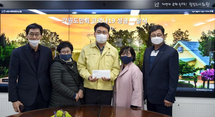 서울 노원구는 최근 구청장실에서 ‘강원도민회와 코로나19 위기 극복 위한 성금 전달식’을 열고 강원도민회로부터 코로나19로 어려움을 겪는 주민들을 위한 성금 335만원을 전달받았다. 사진은 오승록 구청장(가운데)이 관계자들과 함께 기념촬영을 하는 모습. (사진제공=노원구청)