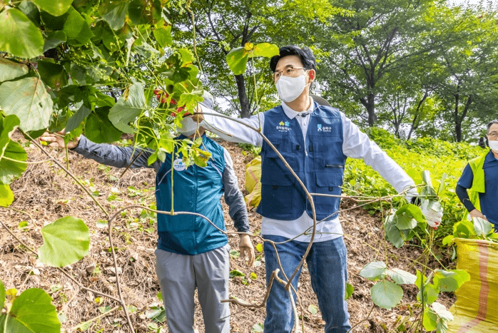 | ▲ 송파둘레길에서 생태교란식물 제거작업 중인 박성수 구청장. (사진제공=송파구청) |