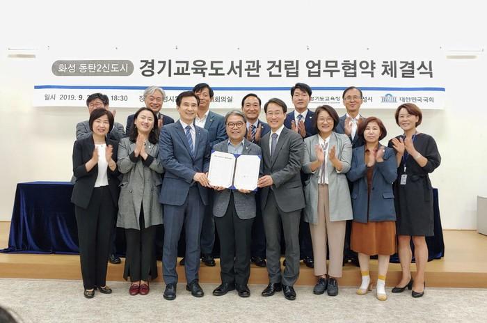 [수원=임종인 기자] 경기도교육청이 최근 화성시청 동탄출장소에서 화성시청, 이원욱 국회의원과 '화성지역 경기교육도서관 건립 업무협약'을 체결했다.