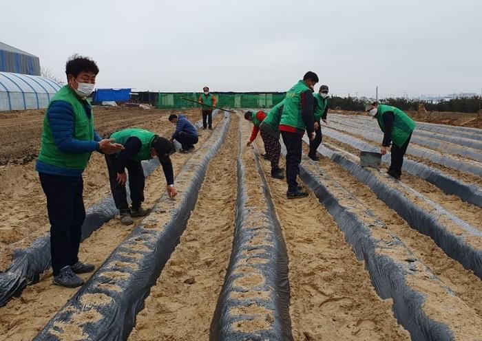 경기 수원시 영통구 영통2동 새마을협의회는 최근 지역내 어려운 이웃 지원을 위한 ‘사랑의 텃밭 가꾸기’를 진행했다. 사진은 이날 참여한 봉사자들이 텃밭에 감자모종을 식재하고 있는 모습. (사진제공=영통구청)