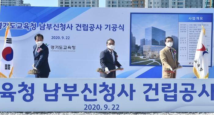 경기도교육청이 22일 수원시 팔달구 경기도융합타운 현장에서 남부청사 이전을 위한 '경기도교육청 남부신청사 건립공사 기공식'을 열었다. 사진은 이날 참석한 이재정 교육감(가운데)과 내빈들이 함께 시삽을 하고 있는 모습. (사진제공=경기도교육청)